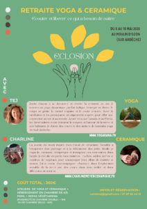 Tej, professeure de kundalini yoga et moi-même, Charline, céramiste, nous vous avons concocté, avec grande joie, une retraite de yoga et céramique sur 3 jours, au Moulin d’Ozon, dans un petit écrin de verdure, à deux pas d’Aubenas, en Ardèche. Le thème est l’éclosion.